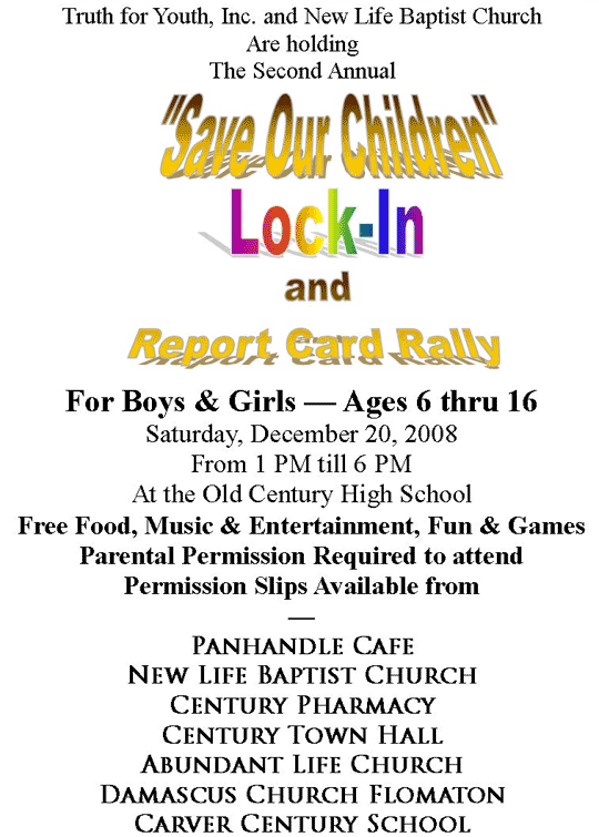 Truth For Youth, Inc. and New Life Baptist Church will hold the second annual “Save Our Children Lock-in and Report Card Rally” from 1 until 6 p.m. today at the old Century High School.