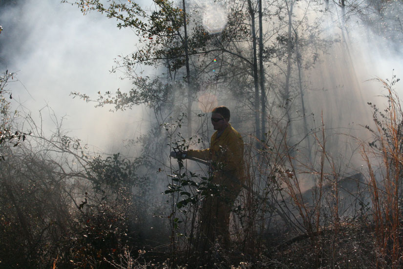 Pictured above: A firefighter from the Walnut Hill station of Escambia Fire-Rescue works to contain a brush fire Friday afternoon on Arthur Brown Road just west of Pine Forest Road Friday afternoon. The fire was the result of an over 100 acre control burn conducted in the area earlier in the day. The fire had burned beyond its intended boundaries. NorthEscambia.com photo, click to enlarge.