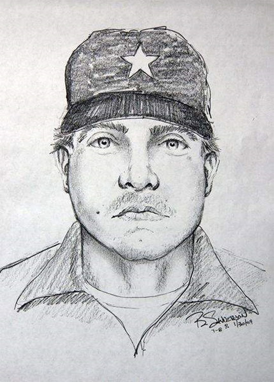 He has been described as a white male in his 20’s or early 30’s. He is reportedly has dark bushy hair, a stocky build and is bout 6′2″ tall. He has a mole under his left eye.