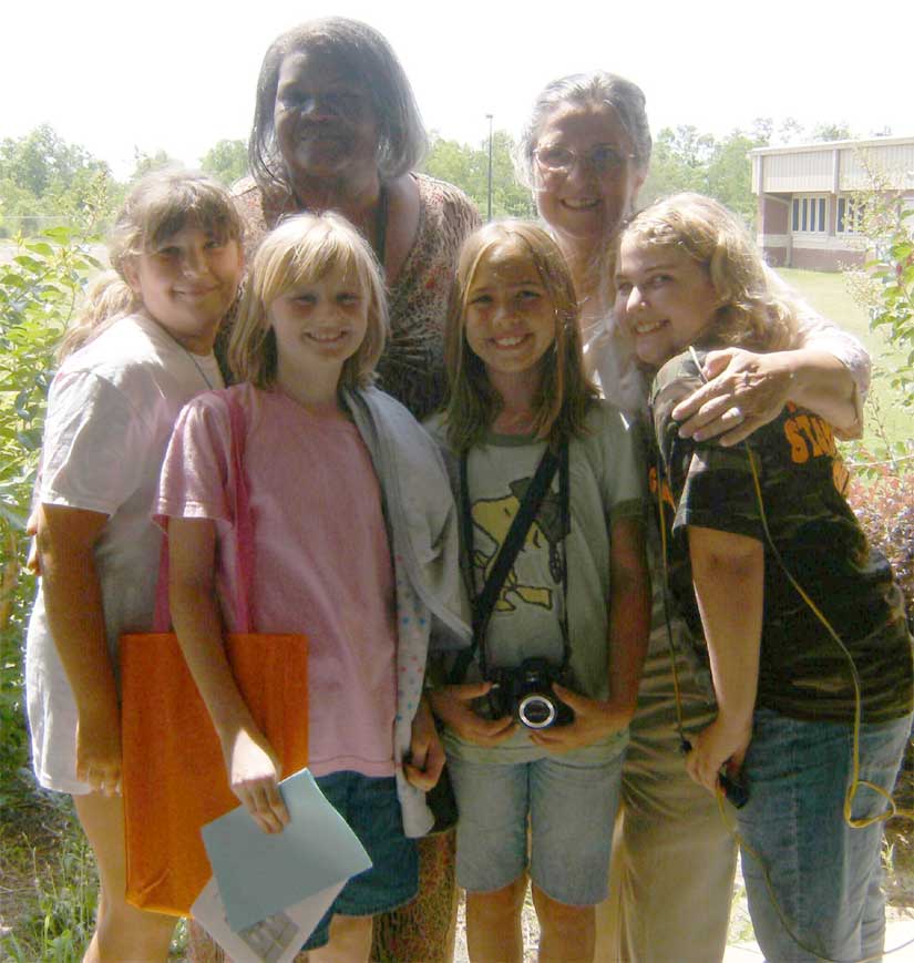 Pictured above: Mrs. Sharon Smith and her fourth grade class wave goodbye about five minutes before their final walk to the buses Friday morning at Molino Park Elementary School. Pictures below: Sharon Smith (top left of photo) and Elaine Barrow pose with students just minutes before they took their retirement walk; and Mrs. Smith at Thursday’s class party. Submitted photo, click to enlarge.