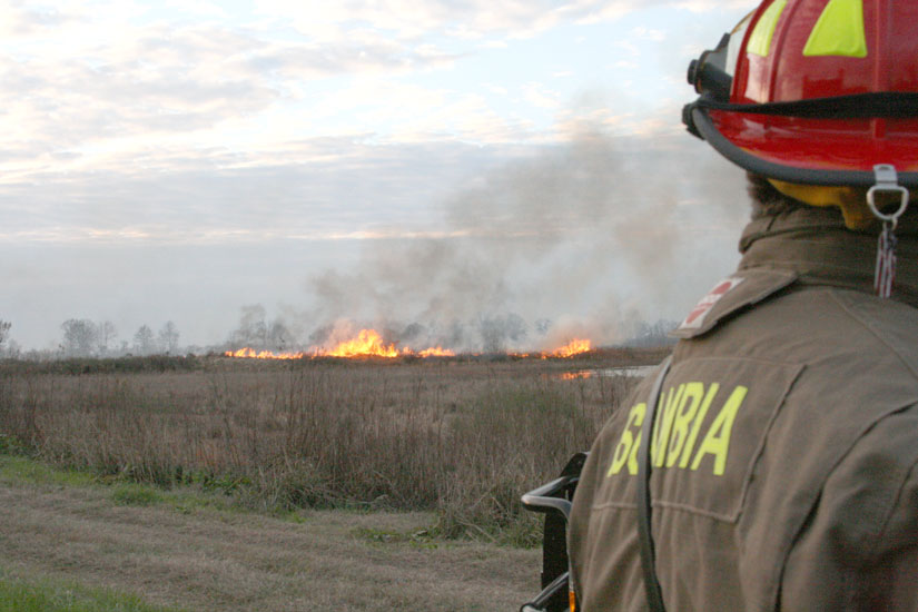 The Walnut Hill Station of Escambia Fire Rescue was dispatched to the report of a brush fire on South Highway 99 near Eicher Road Saturday afternoon. The fire was contained in an empty catfish pond, and it was allowed to burn itself out. Pictured above: A firefighter watches the fire burn from a distance. NorthEscambia.com photo, click to enlarge.