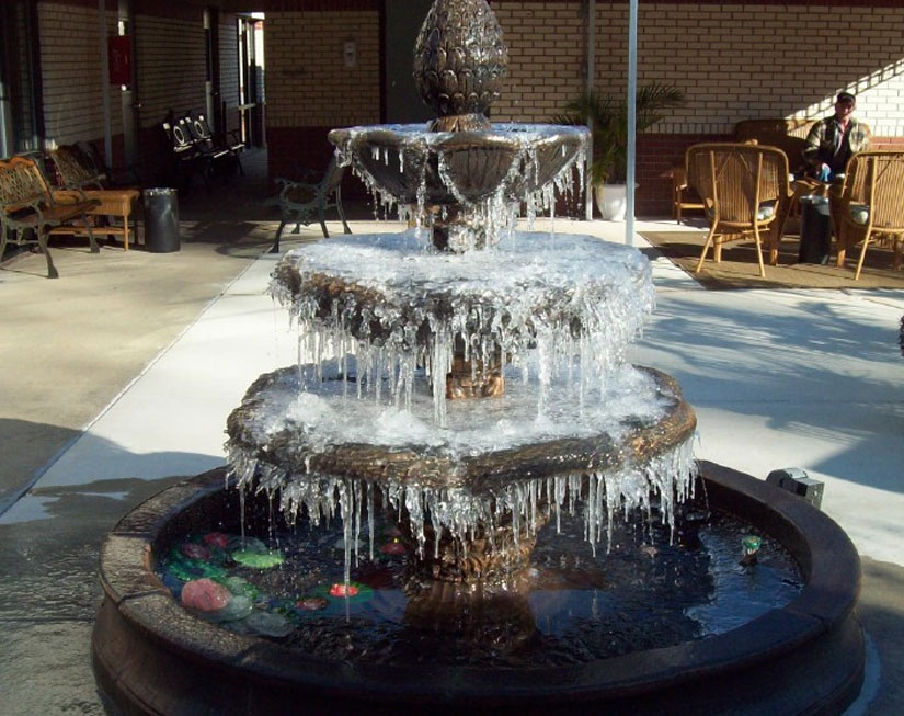 Pictured above: The Nona Hightower Fountain at the Century Care Center was nearly frozen over, complete with icicles, Friday morning. The fountain is named in honor of former Century Care resident Nona Hightower. Submitted photo for NorthEscambia.com.