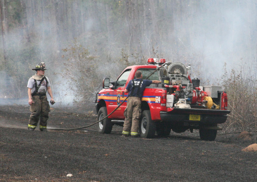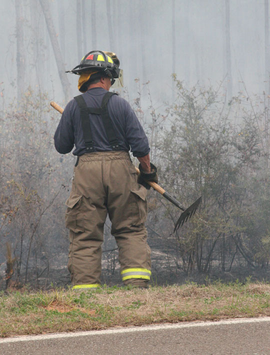 Pictured above and below: Firefighters work to contain a brush fire on Highway 168 Thursday afternoon. NorthEscambia.com photos, click to enlarge.