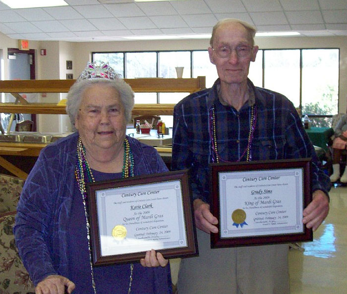 Ms. Katie Clark was named Century Care Center’s Mardi Gras Queen, and Mr. Grady Sims was named CCC’s Mardi Gras King at a Tuesday afternoon Mardi Gras party.