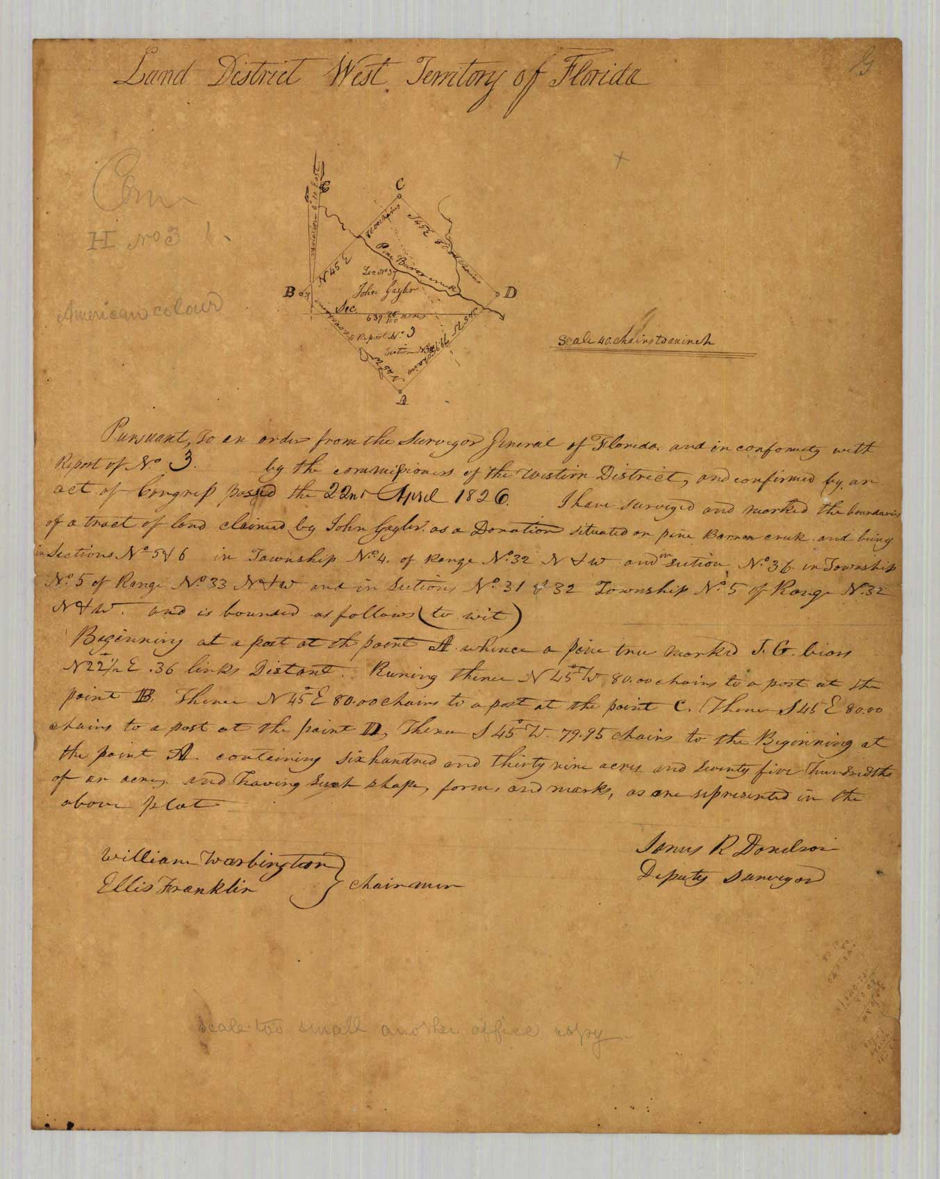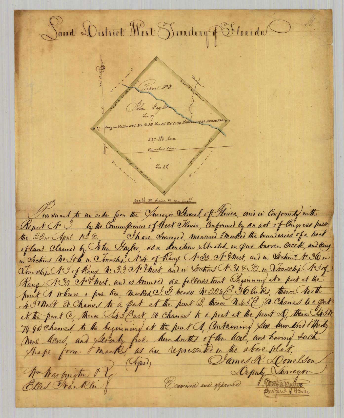Pictured: Copies of the Land District West Territory of Florida records from 1826 confirming John Gaylor’s Spanish Land Claim for land in Walnut Hill. Click to enlarge.