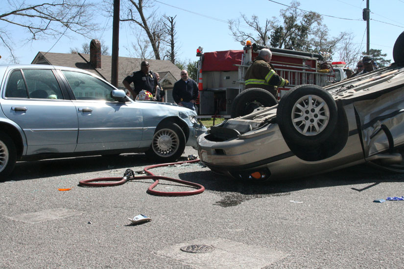 It appeared that the driver of the overturned car failed to stop a stop sign and was hit in on the passenger side by a southbound Mercury Grand Marquis. The driver of the Grand Marquis was not seriously injured in the crash.