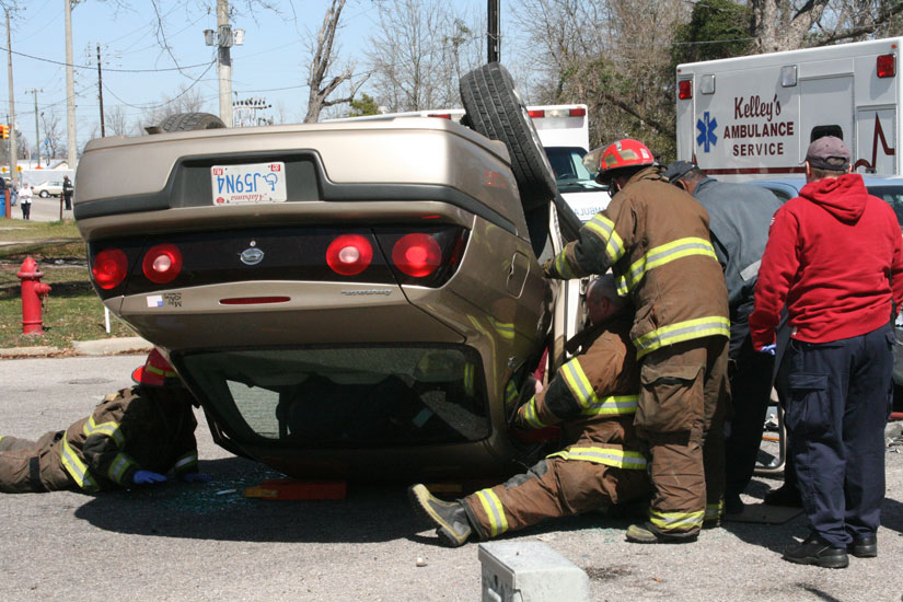 Pictured above and below: Three people were trapped in on overturned car in an accident at Presley and Owens streets in Atmore just before noon today. NorthEscambia.com photos, click to enlarge.