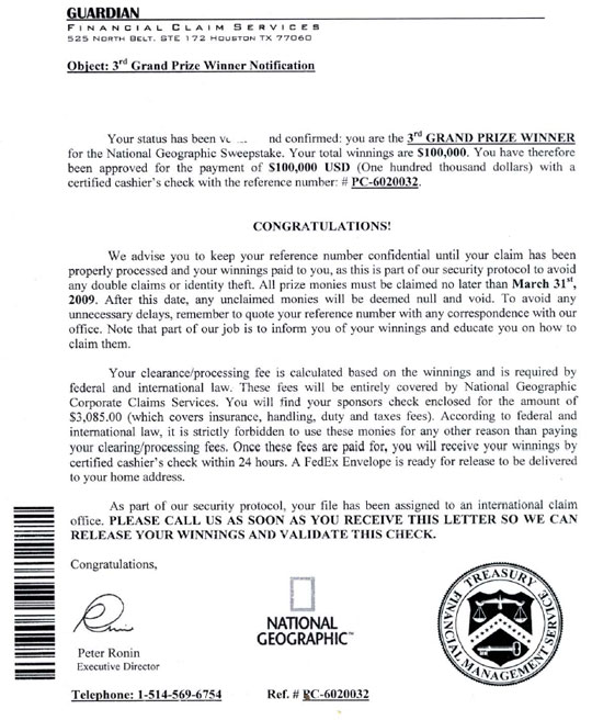 checkletter.jpgThe scam begins with a letter with a Canadian  postmark, according to Senior Deputy David Preston. The letter states that the recipient is the third grand prize winner in a National Geographic sweepstakes with a $100,000 prize. The official looking letter even provides a certified cashier’s check number.