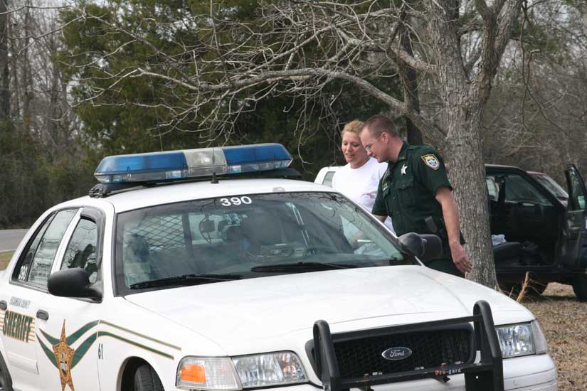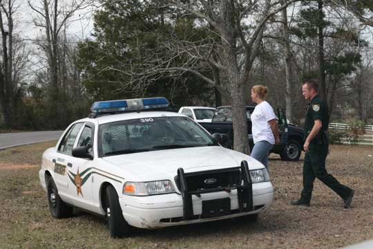 Pictured top and bottom: Suspect Teka Michelle Campbell is placed in a deputy’s cruiser Friday afternoon in Byrneville. Authorities searched for nearly four hours for a male suspect before ending the manhunt. The blue pickup the suspect fled from is in the background of the photo. Pictured middle: An Escambia deputy pulls onto Byrneville Road. NorthEscambia.com photos, click to enlarge.