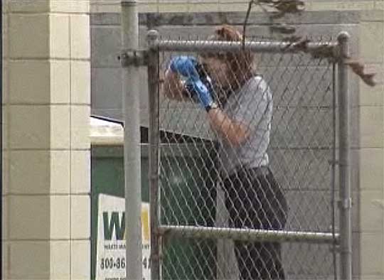 Pictured above: A murdered Cantonment woman was found inside this dumpster in Pensacola Wednesday afternoon. Pictured inset: A crime scene technician takes photographs in the dumpster. Photos courtesy WEAR for NorthEscambia.com, click to enlarge.