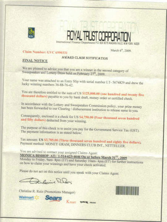 The letter promised that she had one second place in a drawing, and that was worth the $125,000. The $4,750 check was included for her to pay $3,785 in taxes, the letter said. The letter instructed her to call a telephone number that appears to be a cell phone in Montreal, Canada. A person at that number was to instruct her how to pay her taxes after depositing the check.