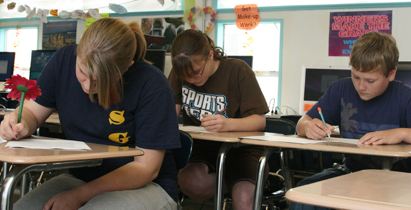 Pictured top: Ernest Ward Middle School students (L-R) Dezarae Turner, Jeremy Stacy and Anna Donald proofread the latest issue of the school’s newspaper. NorthEscambia.com photo, click to enlarge.