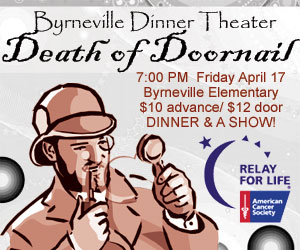 The Byrneville Elementary and Byrneville Friends Relay for Life teams will present “Death of Doornail”. This is a dinner theater on April 17 at 7:00. Tickets are $10.00 in advance and $12.00 at the door Friday. Spaghetti dinner included. All proceeds go to the American Cancer Society Relay for Life. Advance tickets are available at Byrneville Elementary.