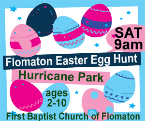 The First Baptist Church of Flomaton will hold their annual Easter Egg Hunt at Flomaton Hurricane Park on Saturday, April 11 from 9 until 10:30 a.m. for children ages 2 through 10. Bring a lawn chair or blanket, an Easter basket and three plastic eggs. Other activities include a sack race and an egg-in-the-spoon race. Call the church at 296-2453 for more information.