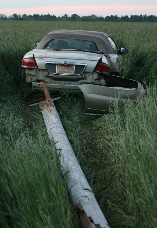 The accident happened on Highway 97 about a half mile south of Tungoil Road about 7:15 p.m.. The driver of a car apparently lost control and struck a power pole, breaking it into pieces and pulling it from the ground. Power lines were also downed in the incident that left the car in a wheat field.