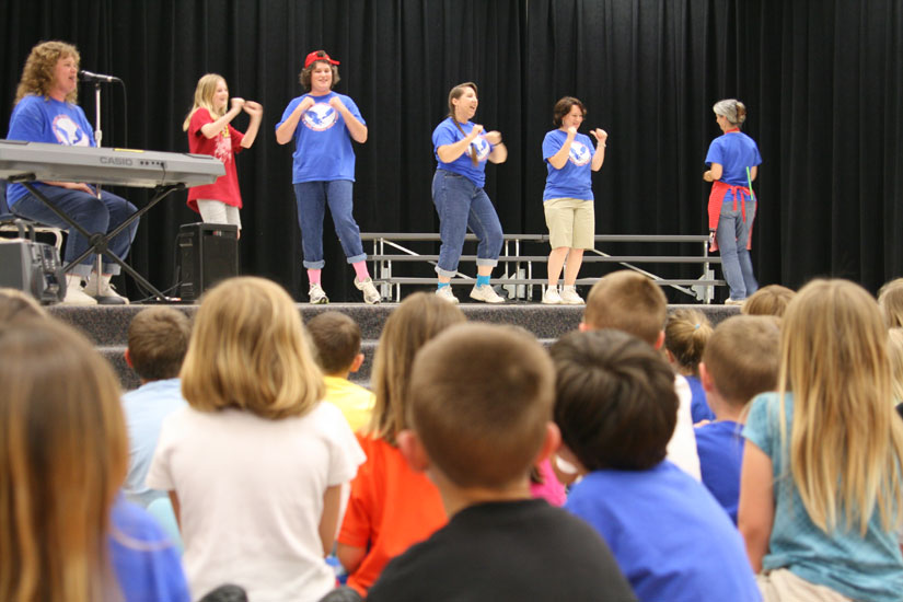 Pictured above: Singer/songwriter Sheila Allen, Harmony Till (daughter of Linda and Brian Till), Linda Till, Suzanne Plenkers, Angela Hasselbrock and Donna Sutton perform at Molino Park Elementary Friday afternooon. NorthEscambia.com photo, click to enlarge.