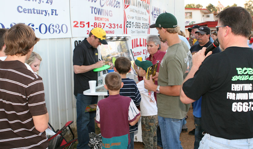 Pictured above: NASCAR driver Kenny Wallace’s #36 at Flomaton Speedway Wednesday night. Pictured inset: Wallace signs autographs. Pictured below: Wallace in a group photo with IMCA Class drivers. Submitted photo by Mike Newton Photography for NorthEscambia.com, click to enlarge.