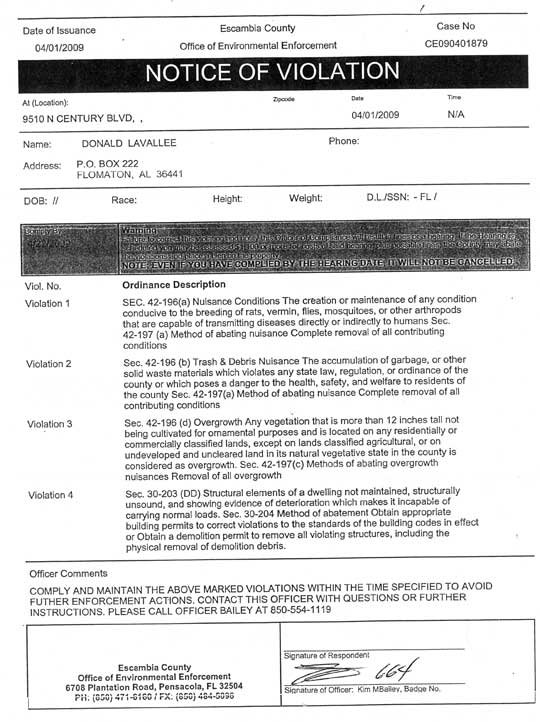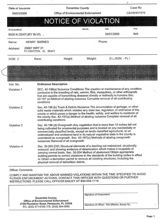 Monday night, Century Mayor Freddie McCall produced copies of the Escambia County Office of Environmental Enforcement citations issued for properties at 9500 and 9510 North Century Boulevard…the buildings across from the Piggly Wiggly. (Click the citations to enlarge them.)