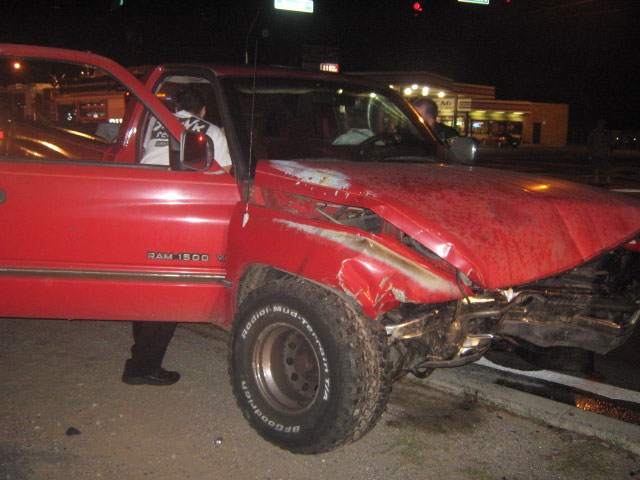 Pictured above: The driver of this Hyundai and his young passenger were seriously injured in a two vehicle accident in Cantonment Saturday night. Pictured below: The driver of this truck was also seriously injured in the head-on collision. Submitted photos by Tina Pendleton for NorthEscambia.com, click to enlarge.