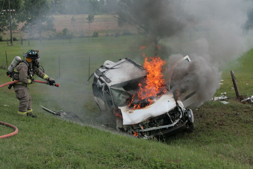 Pictured above: Three people were injured in this accident on Highway 97 Tuesday morning. The Blazer burst into flames shortly after the last passenger was pulled from the wreckage. Pictured below: The first firefighters on scene about to extinguish the flames. NorthEscambia.com exclusive photos, click to enlarge.