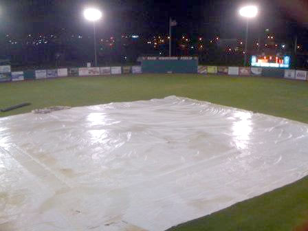 Pictured above: The rains came during the Pensacola Pelicans game Thursday night. Submitted photo for NorthEscambia.com, click to enlarge.