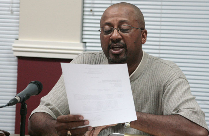 Pictured top: File photo showing the inside the Helicopter Technology building in February 2008. Pictured inset: Council member Henry Hawkins reads a document to the Century Town Council Monday night. NorthEscambia.com photos, click to enlarge.