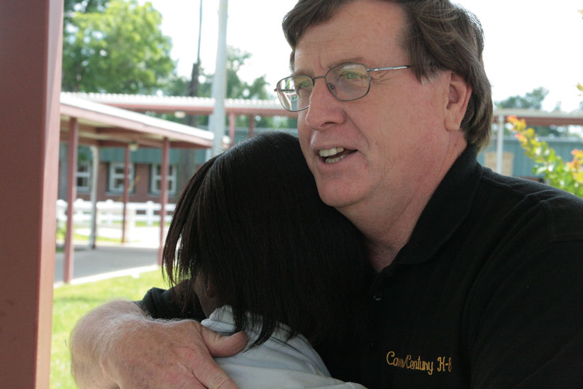 Pictured top: Jeff Garthwaite hugs a student goodbye on the last day of school last May at Carver/Century K-8 School. Pictured inset: Garthwaite addresses the audience at the school’s final eighth grade graduation. NorthEsambia.com file photos, click to enlarge.