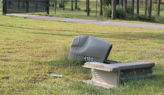 Pictured above: One of the mailboxes destroyed on Highway 97A near Walnut Hill. NorthEscambia.com photo, click to enlarge.