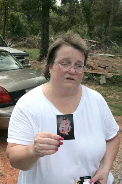 Pictured above: When the tree in this photo was cut Tuesday morning, it struck and killed a Century man. Pictured below: Investigators at the scene. Pictured insets: Coy Otis Rhea and Kathy Brady holds the photo of her father. NorthEscambia.com photos, click to enlarge.