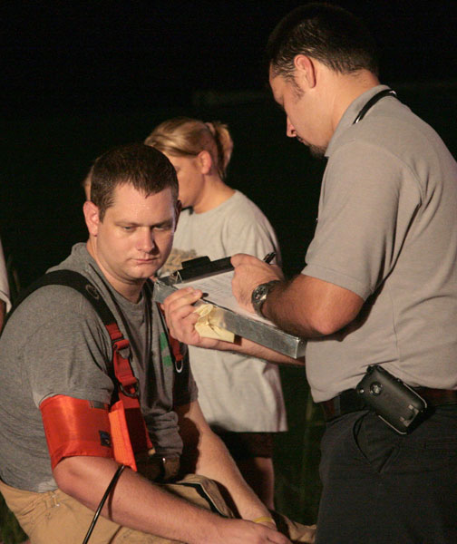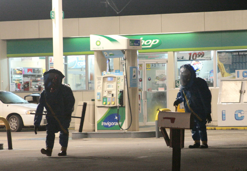 As the Hazmat team members left the parking lot, they were required to go through a decontamination shower, and then they received a scrub-down from other team members dressed completely in protective clothing and wearing breathing apparatus. Personnel from Atmore Ambulance checked the vital signs of emergency personnel both before and after they entered the scene to ensure that they were not harmed by the acid.