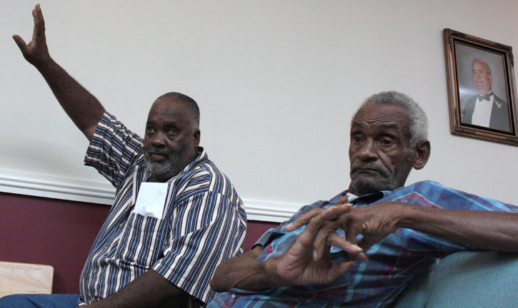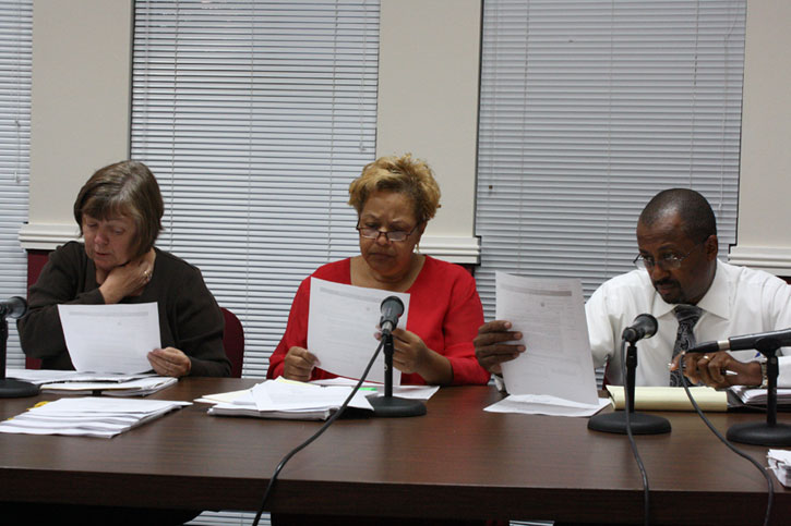 Pictured above: Herman Pleasant, left, waits his turn to address the Century Town Council Monday night while Eddie Stallworth, right, listens. Pictured inset: Century Council members (L-R) Ann Brooks, Sharon Scott and Henry Hawkins review code enforcement documentation. NorthEscambia.com photos, click to enlarge.