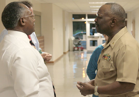 Pictured top: Parents and students at Northview High School’s open house Tuesday evening. Pictured left: Deputy Superintendent Norm Ross (left) visits with Senior Chief Lee Coleman. NorthEscambia.com photos, click to enlarge.