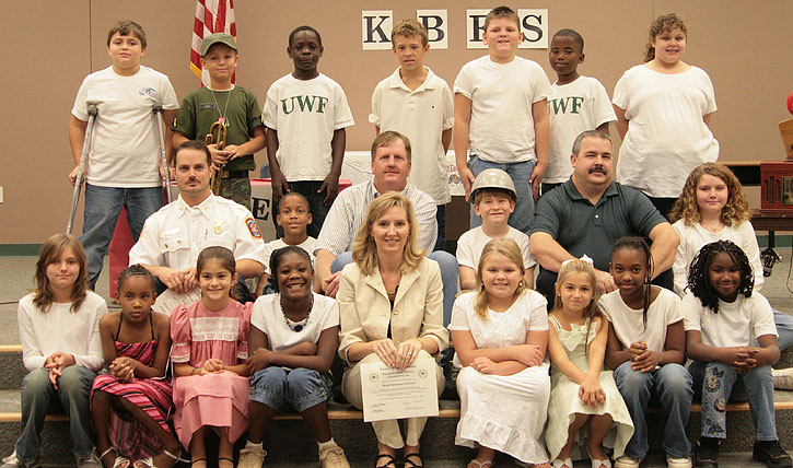 Pictured above: Bratt Elementary School’s Partners in Eduction surrounded by some of the fourth graders that presented Thursday morning’s play. Partner representatives pictured are (top row, L-R): Walnut Hill Volunteer Fire Department Chief Chris Brown, Bubba Hammock from Bondurant of Century, Pastor Gary Wieborg from the First Baptist Church of Bratt, and (bottom middle) Sabrina Owens from Escambia River Electric Cooperative. Pictured inset: Students perform for the partners. NorthEscambia.com photos, click to enlarge.