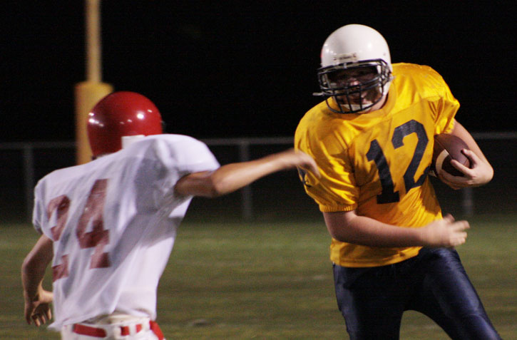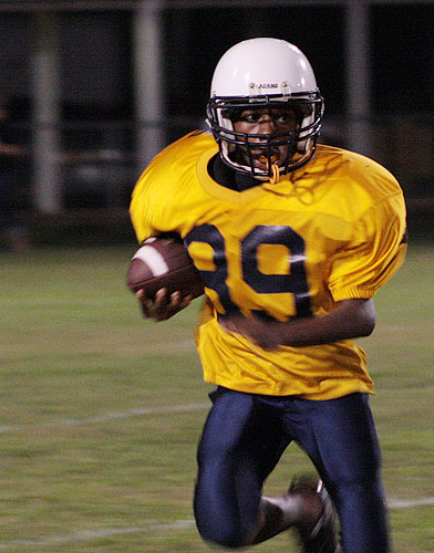 Pictured top: Tristan Montgomery makes a gain for the Eagles. Pictured inset: Jaylen Parker gains yardage for EWMS. Pictured below: Eagles cheerleader Jadlyn Agerton soars at the top of cheerleader tower Thursday night. NorthEscambia.com photos, click to enlarge.
