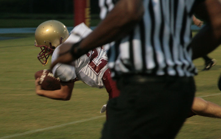 Pictured top: The Chiefs’ Reid Bell picks up yardage against West Florida Tech Monday night in Bratt. Pictured top inset: Harold Harrison sprintsf on a 33-yard touchdown run for the Chiefs. Pictured bottom inset: Jamie Gafford on the run for the Chiefs. Pictured bottom: Harrison dives in for a touchdown (just as a referee runs into the photo). NorthEscambia.com exclusive photos, click to enlarge.