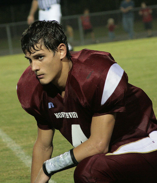 Pictured top: Dustin Yuhasz (#4) is flanked by Ka’Daris Grice (#3) and Brad Lowery (#12). Pictured inset: Yuhasz watches a recent game from the sidelines. NorthEscambia.com file photos, click to enlarge.
