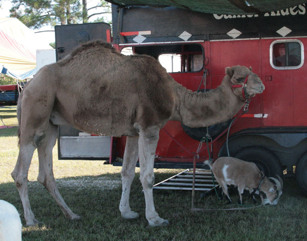 Pictured top and bottom: Workers raise the big top tent this morning. for the Lewis & Clark Circus. Pictured inset: This camel is one of many animals in the show. NorthEscambia.com photos, click to enlarge.