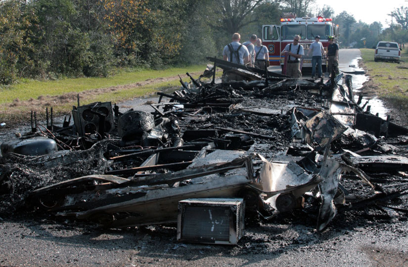 I heard some sirens coming down my road and I went outside to see where they were going and they actually went just right around the corner from my house; I could see through the trees the big flames burning, I thought it was a neighbors house or trailer, so I rode down to see; and luckily it wasn’t… They have the prisoners out there cleaning up the burnt debre, hopefully it hasn’t made big holes in the road, and luckily the people that were pulling the trailer got their truck unhitched before it went up in flames too…