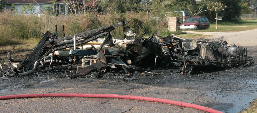 Pictured above and below: This is all that remained of a pull-behind camper that burned Monday afternoon on Killam Road near Century. NorthEscambia.com photos, click to enlarge.