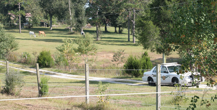 Pictured above: The Escambia County Sheriff’s Department and Escambia County EMS respond to a home invasion victim Tuesday morning at Highland Baptist Church. Pictured below: An Escambia County deputy pulls away from the scene of Tuesday’s home invasion. NorthEscambia.com photos, click to enlarge.