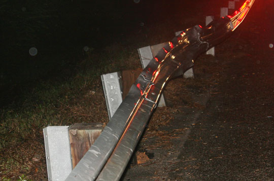 Pictured above: This truck hit q a power pole after going over a guardrail Saturday on Highway 97 south of Walnut Hill. Pictured below: Some of the damage to the guardrail. NorthEscambia.com photos, click to enlarge.