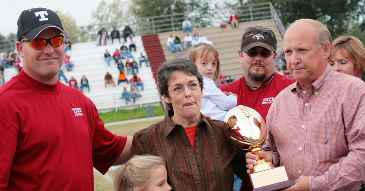 Pictured above: Action from the Miracle Bowl Saturday between Tate and Northview high schools Pictured below: Tate Head Coach Ed Rigby presents a Miracle Bowl Trophy to Miracle League founders Larry and Donna Thompson. NorthEscambia.com photos, click to enlarge.
