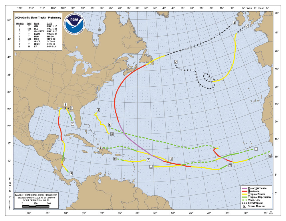 Pictured above: 2009 Atlantic storm tracks. Click to enlarge.
