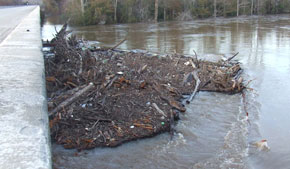 Florida Fish and Wildlife Conversation Commission Officers Steve Hoomes and Gary Ridaught were patrolling near the Escambia River at Fisher Landing in Century. The officers heard barking from the river and investigated. They located the source of the barking under the Highway 4 Bridge where a large number of logs had created a log jam. A small dog had somehow become stranded on the logs piled against the bridge pilings.