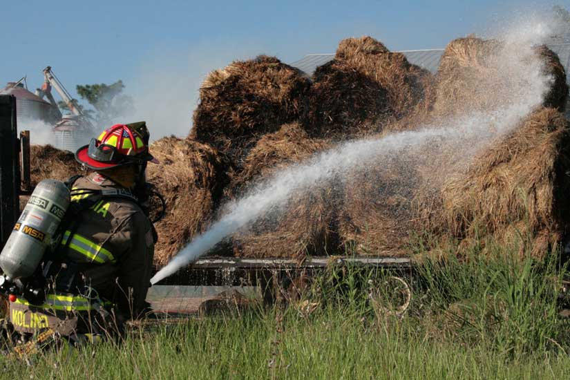 Molino firefighters battle a smoldering fire in a trailer load of hay.