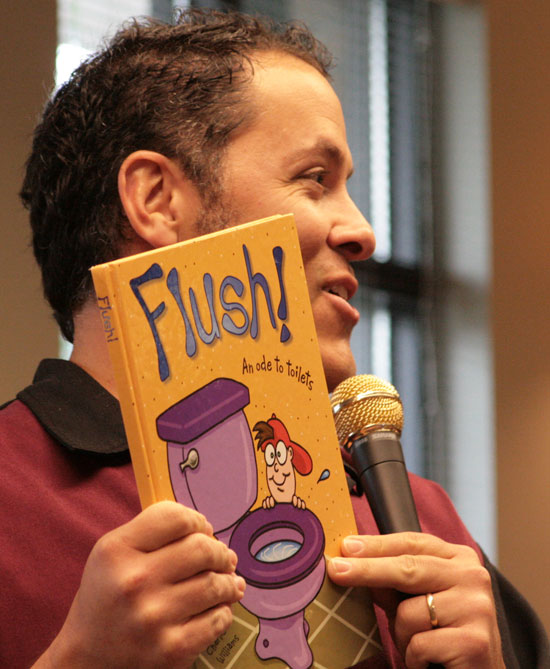 Charlie “The Noise Guy” Williams reads “Flush: An ode to toilets” at the Century Branch Library during a summer reading program.