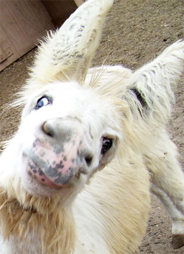 Hi—Burrito’s Mom here! For a note on the “needs grooming”: It doesn’t matter HOW MANY times (a day or week) that I clean up my little donkey, he looks like that nasty picture again within hours! He is just like a young boy . . . if he can find a mess (spilled water/mud, Cow Boy “pies”, anything), he will ROLL in it. (Although I didn’t send William any of B’s pictures illustrating his more “basic” instincts, I do have a lot of them!) So I really do look forward to Spring, when his long baby hair will shed out and he might stay cleaner!