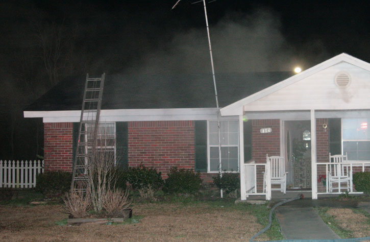 Pictured above: Firemen prepare to enter the front door of the home. Pictured below: The fire was confined mostly to the attic of the home. NorthEscambia.com photos, click to enlarge.