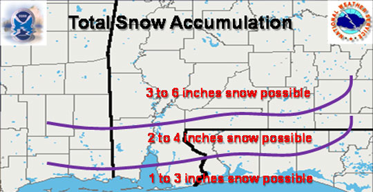 “Snowfall totals are expected to range from perhaps nothing at the coast to six more inches north of Atmore.”