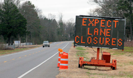 Pictured above: A sign in Davisville warns of impending lane closures on Highway 97. NorthEscambia.com photo, click to enlarge.